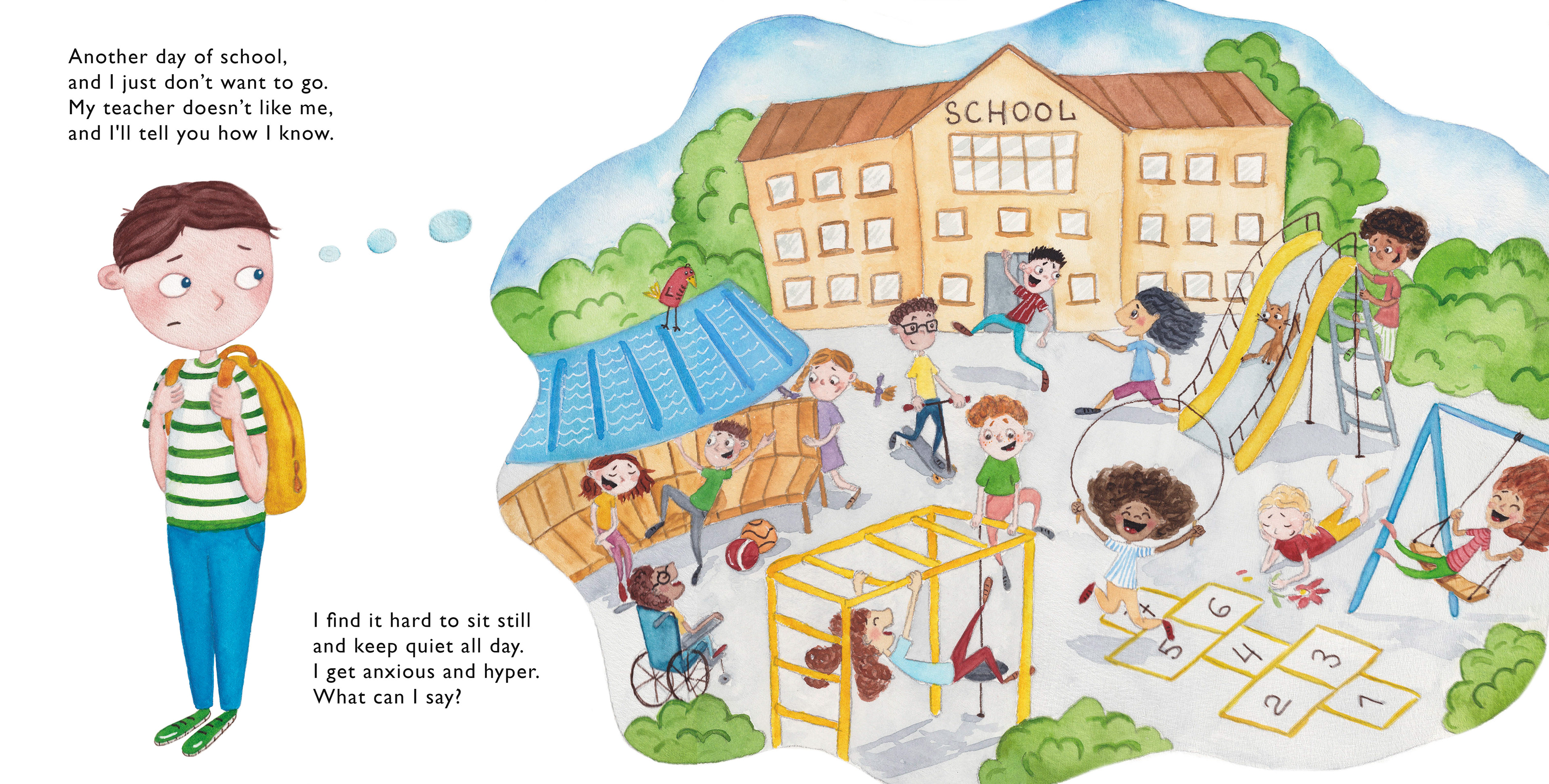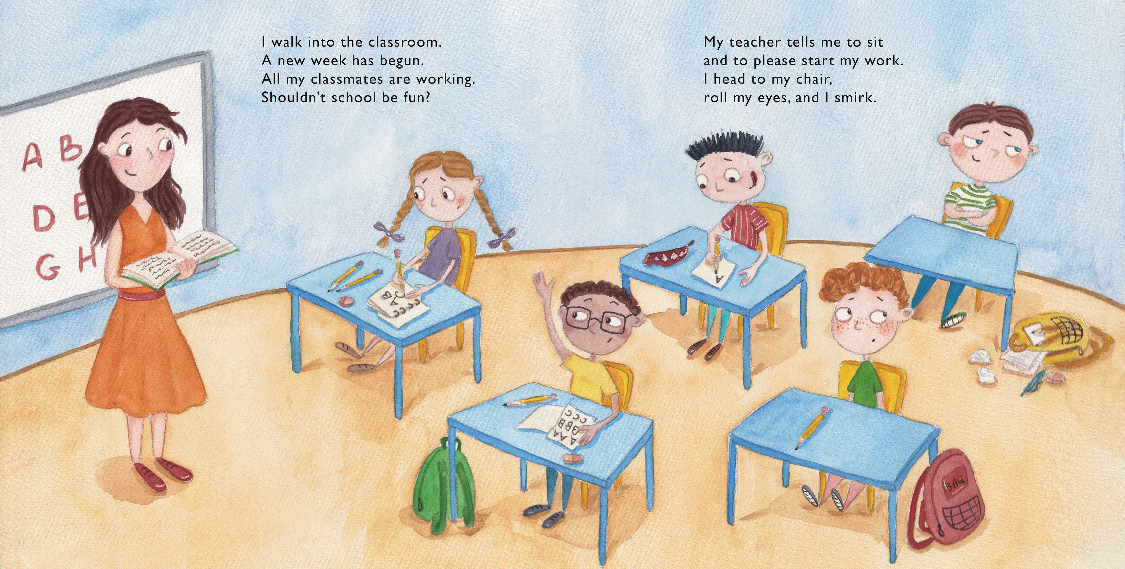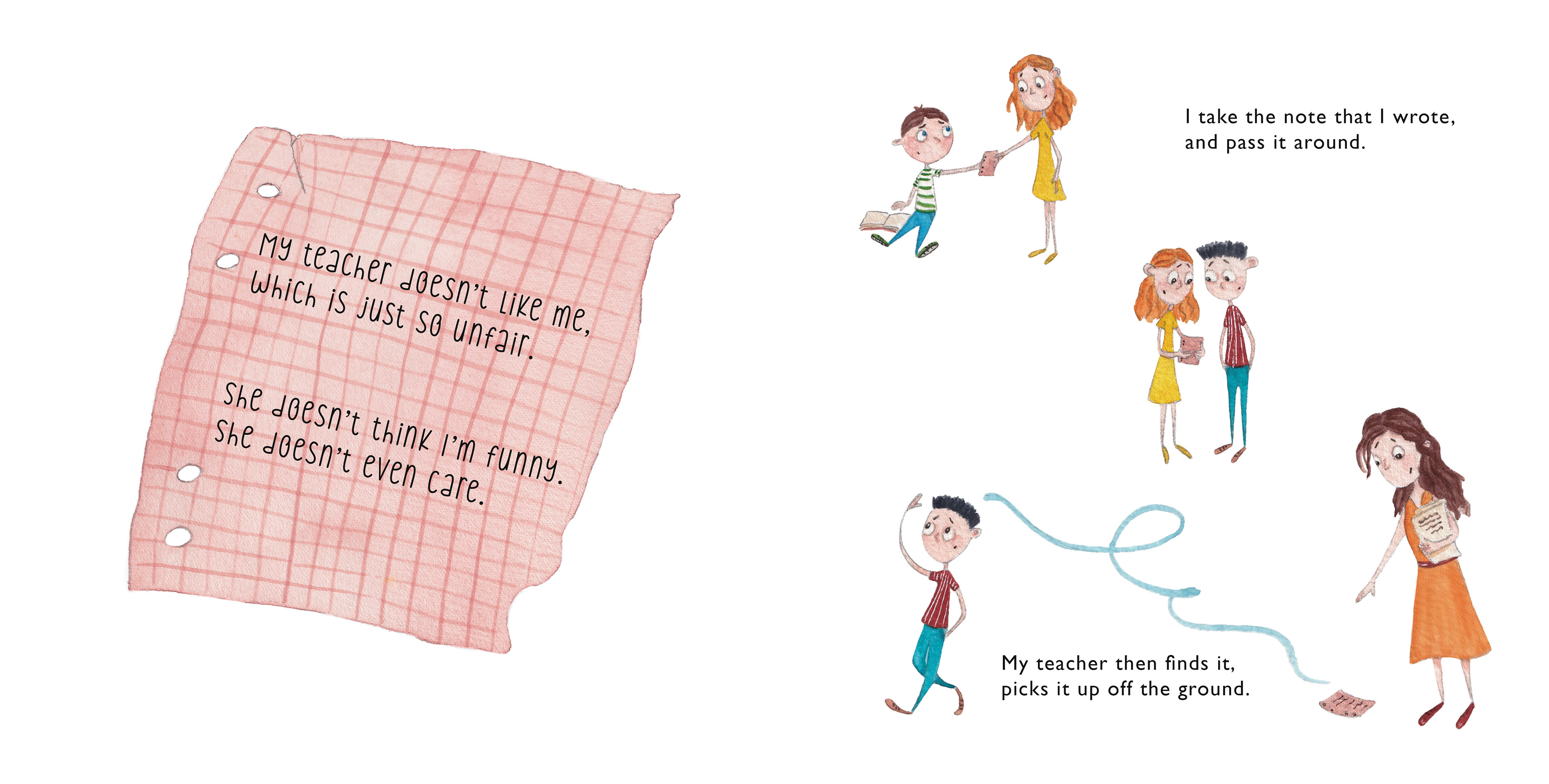 The main character of the book has ADHD and often acts out during lessons disturbing other students and interrupting the learning process. During reading time he writes a note which says My teacher doesn't like me and passes it around. His teacher then finds it and asks him to stay after lessons to talk.